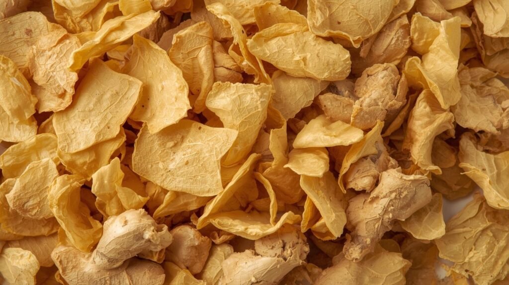 The flakes are crisp, golden-yellow, and carry a strong aroma, making them a perfect substitute for fresh ginger in soups, sauces, curries, teas, and spice blends.